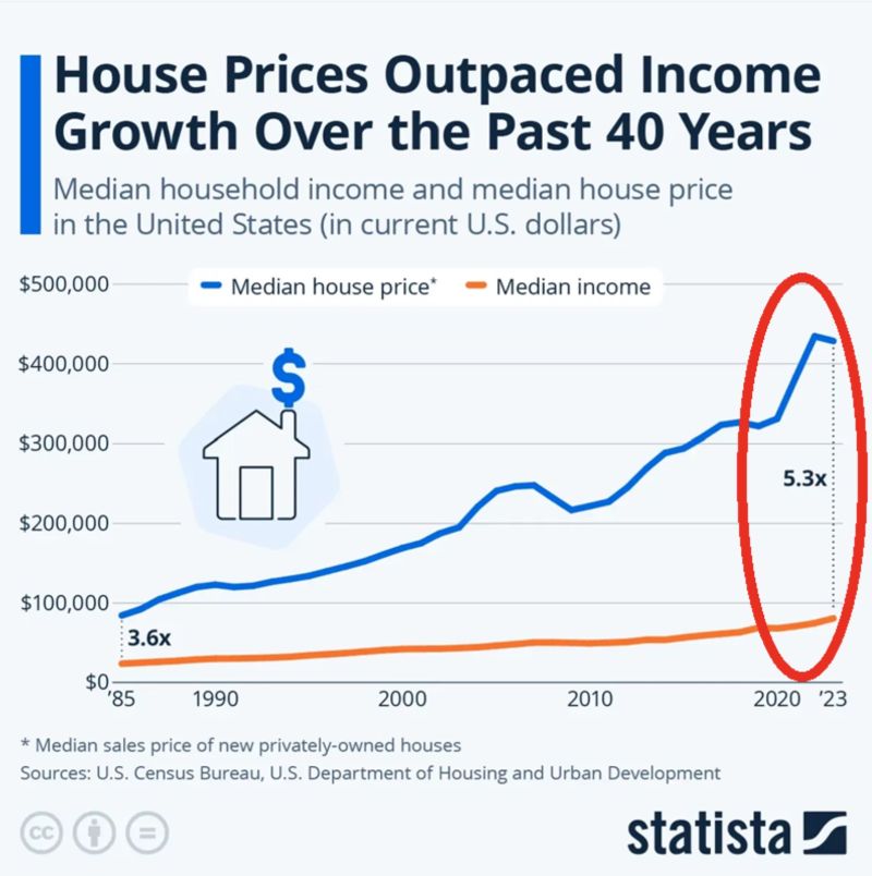 House prices have outpaced median income growth over the last 40 years. Median house price is now 5.3 TIMES larger than the annual median US income. By comparison, in the 1980s, the difference was 3.6x. Source: Global Markets Investor, Statista