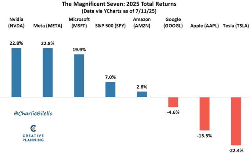 -Nvidia/Meta/Microsoft outperforming -Amazon/Google/Apple/Tesla underperforming Big shift from the previous few years when they all moved in tandem. Source: Charlie Bilello